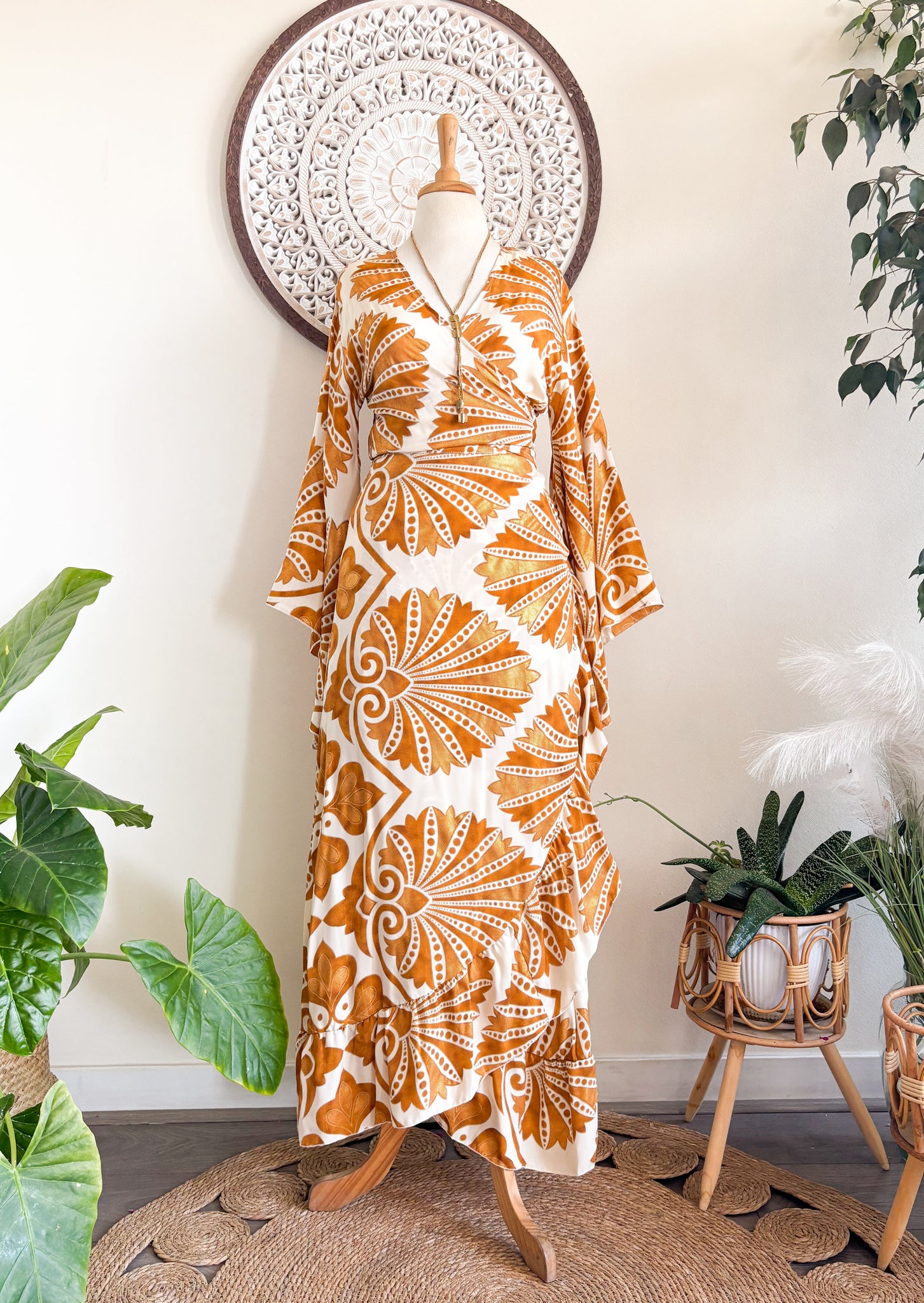 Conjunto con diseño envolvente, pollera tipo pareo, ajustable en la cintura, y top kimono, el cual lo puedes usar cruzado, con escote frontal o trasero, o simplemente amarrado en el frente.